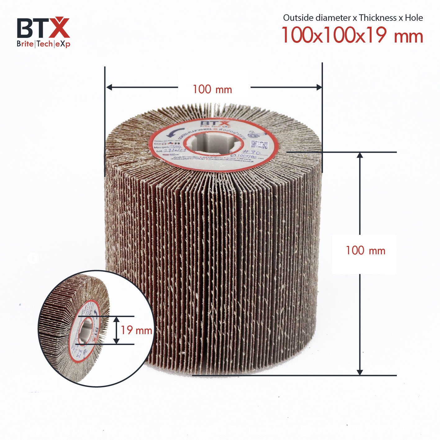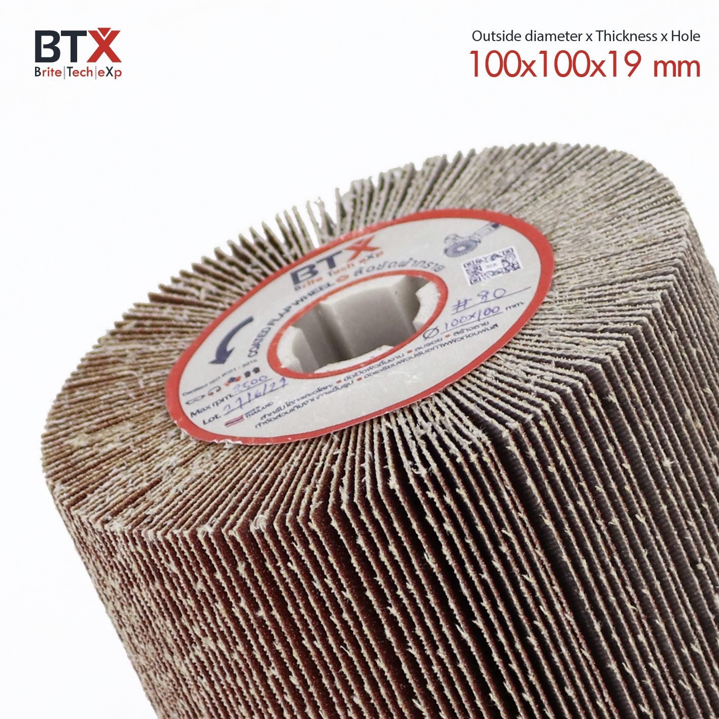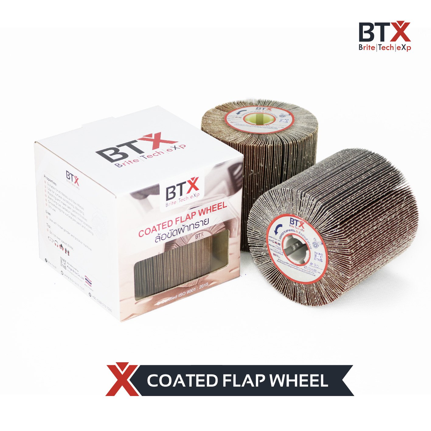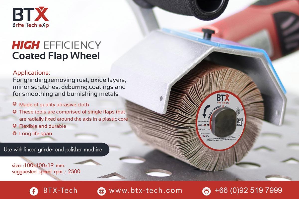 BTX Coated flap wheel made of High quality abrasive cloth. These tools are comprised of single flaps that are radially fixed around the axis in a plastic core.
